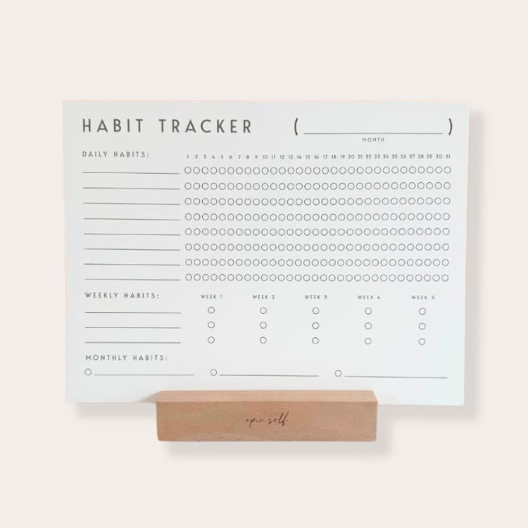 Haven’t you heard? Holding yourself accountable is always in style. With 12 undated habit tracker cards and a chic wooden holder, display this on your desk to hold yourself accountable and get intentional with your actions this year.