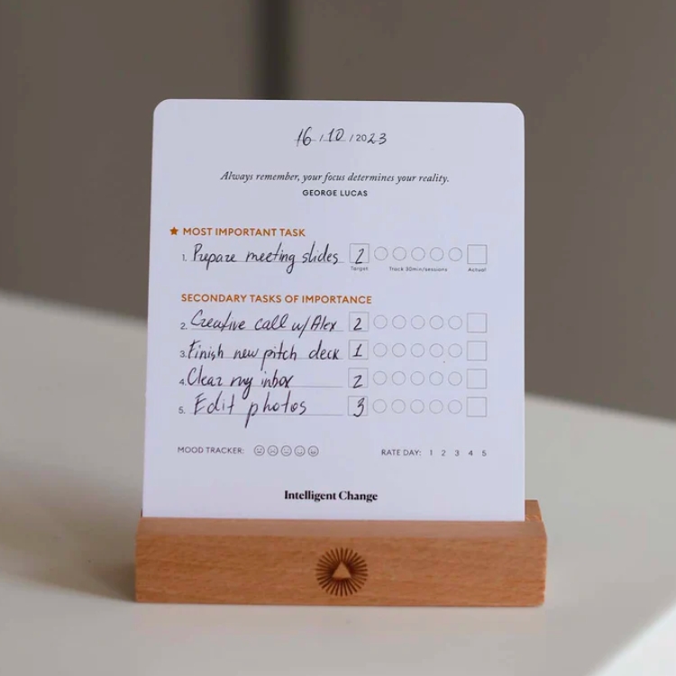 If you prefer planning out your day in the morning instead of the week ahead, you’ll love these cards. By having you focus on just five tasks for 30 minutes with five-minute breaks in order from most to least important and urgent, you can get more done in less time and improve time management tenfold. Plus, you get a wooden holder to display your card on and a space to rate your day before clocking out so you can come back better the next.
